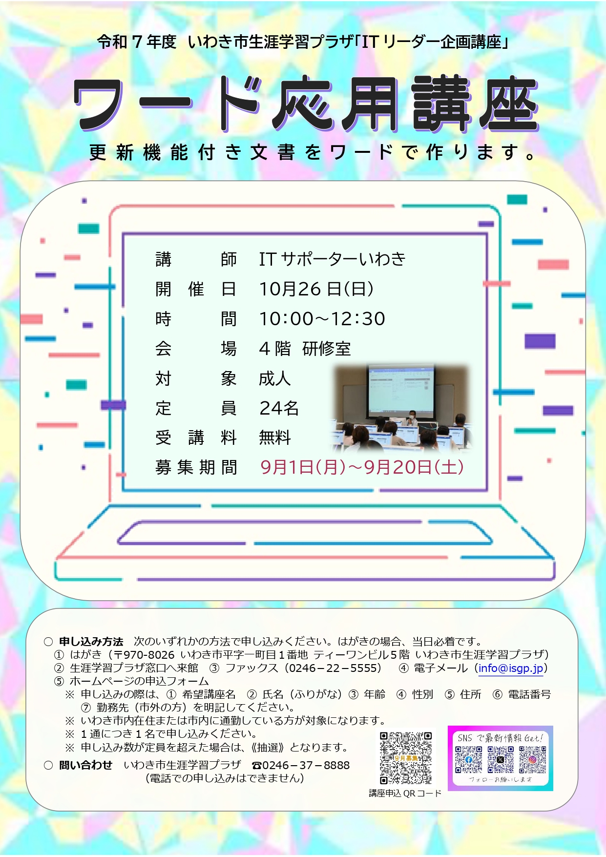 ワード応用講座(R7.10.26) 2025.11.092026.04.03 講座の様子 ワードの更新機能付き文書作成について学習した。ワードの更新機能は日付やその日の予定など様々な用途に合わせ自動的に反映できる機能で、使いこなすことができれば文書作成の効率化と業務活用力の向上が期待できる。応用講座だけあって講座内容は難しかったが、講師の指導により受講者の満足度は高かった。参加者からは、使ったことのない機能を知ることができてよかった、テキストを見ながら自宅でもチャレンジしてみます、との声が寄せられた。 講座概要 開 催 日 令和7年10月26日(日) 10:00~12:30 場 所 4階 研修室 受講者 14名 受講対象者 成人