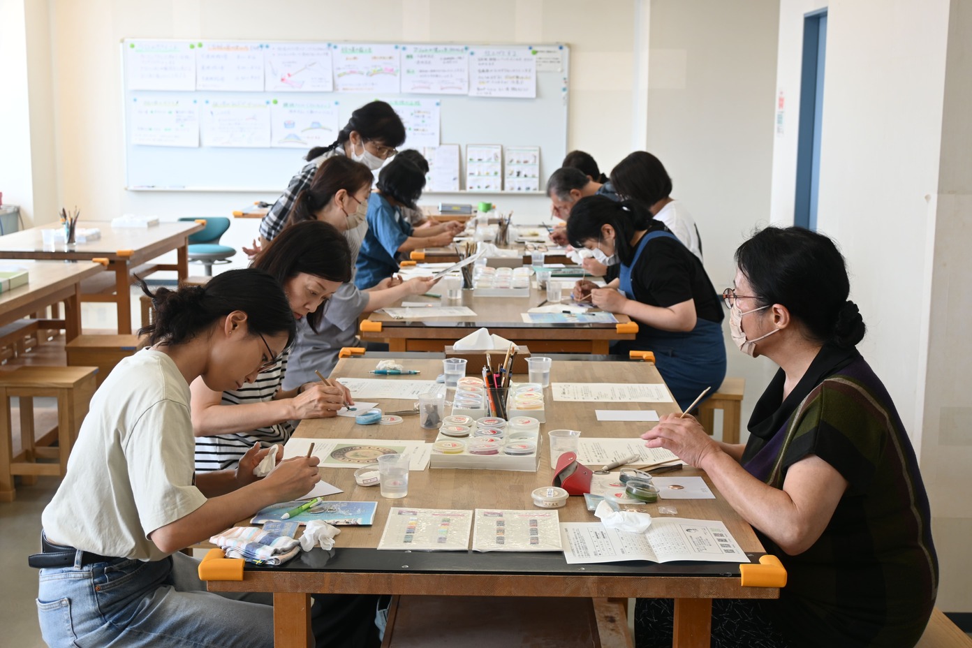 銅板の上に、色のついたガラス材を薄く均等に塗っていく作業は難しく、苦労しましたが、いろんなオリジナルデザインの七宝焼のアクセサリーを製作することができました。噴釉(ふんゆう)や描き割り、多色盛りなど七宝焼の様々な技法を駆使して、作品を楽しそうに仕上げました。各テーブルでは、お互いに作り方の相談をしたり、デザインなどについて話し合ったり、初めての方でもお話ししながら楽しく講座に臨むことができました。