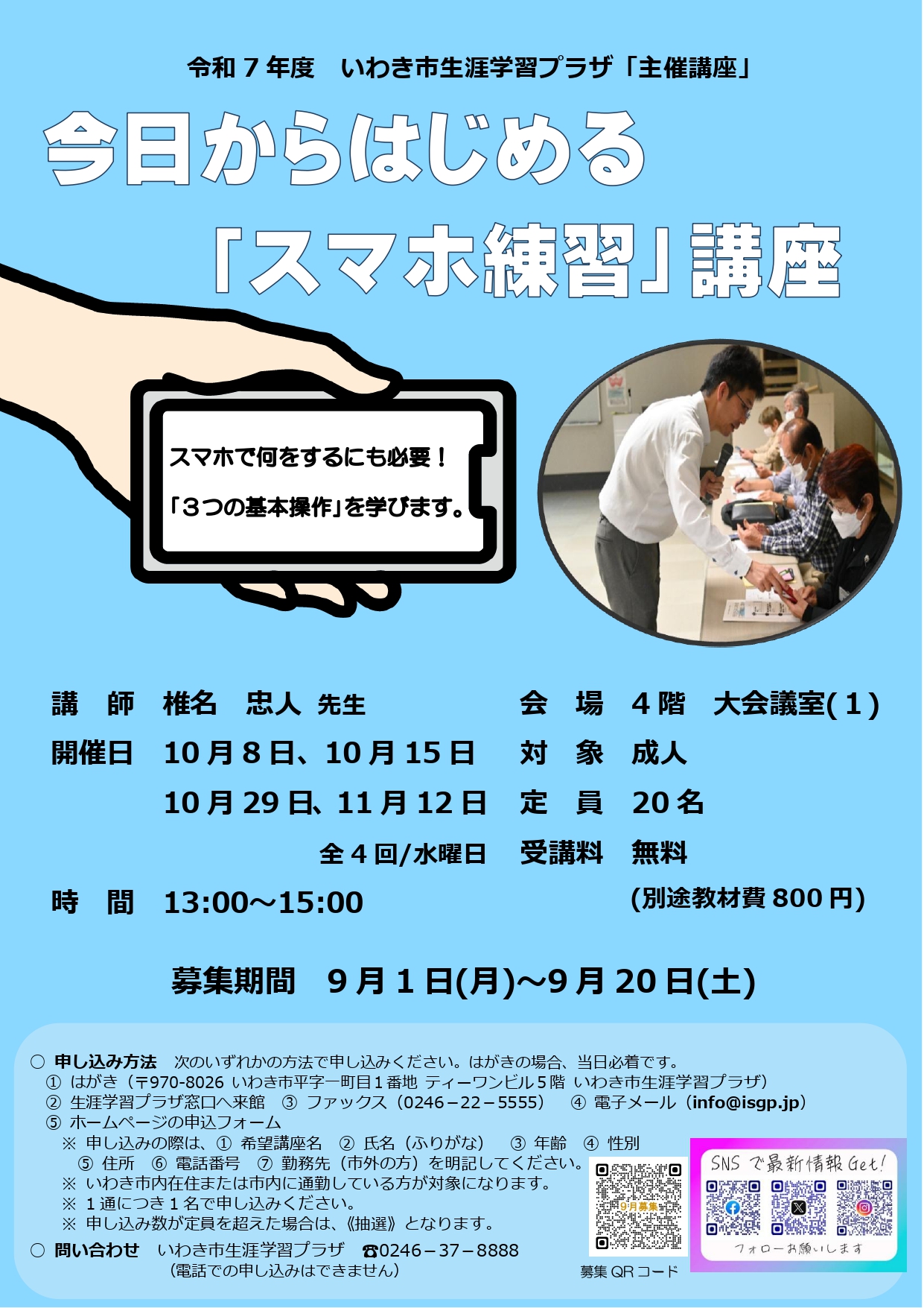 今日からはじめる「スマホ練習」講座(R7.11) 2025.12.092026.04.03 講座の様子 スマートフォンの基礎知識からメールでの文字入力、検索の仕方、LINEの友達登録の仕方など、基本的な操作方法を学びました。スマホ講座は、生活に直結するICTスキルを学べる場として人気があり、特に高齢者にとっては、家族や地域とのつながりを広げる効果が大きく、地域活動の一環として用いることができるツールのため、継続的に続けていきたいです。参加者からも次回も開催してほしい、一人一人に合わせていただいてすごくわかりやすかった、との声が寄せられました。 講座概要 開 催 日 令和7年10月8日・15日・29日、11月12日 全て水曜日13:00~15:00 場 所 4階 大会議室⑴ 受講者 延べ62名 受講対象者 成人