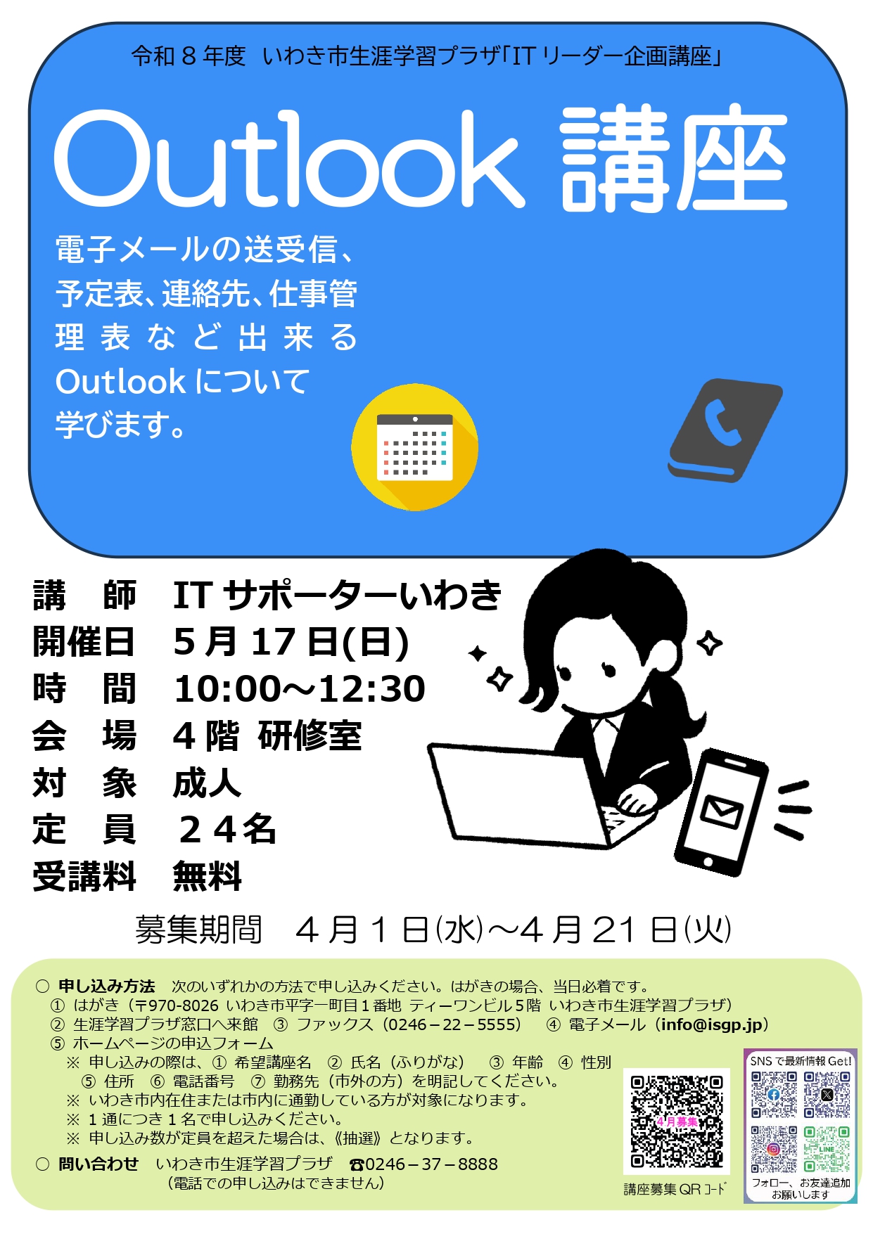 | 地域の課題を正しく理解し、持続可能な地域社会を共に創り出します | 電子メールの送受信、予定表、連絡先、仕事管理表などが出来るOutlookについて学びます。 | ||||||||||