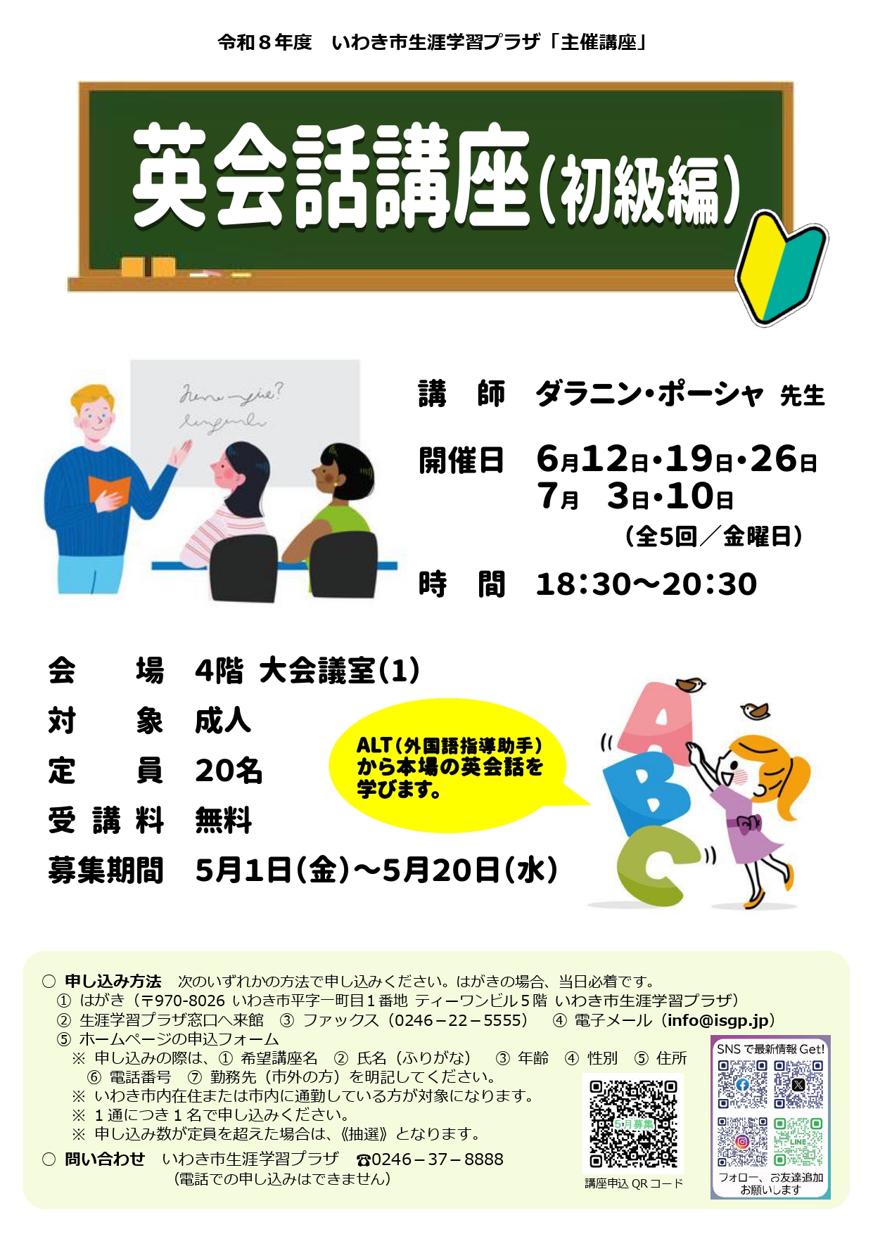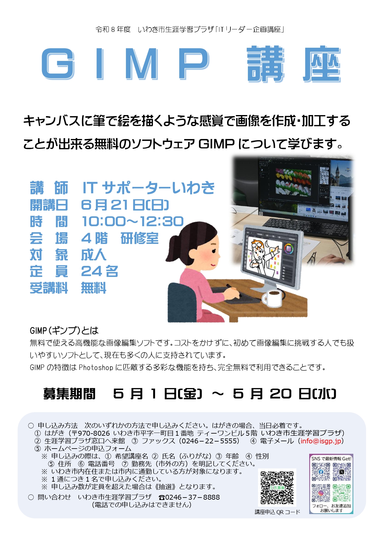 ・ 申し込みの際は、希望講座名、氏名(ふりがな)、年齢、性別、住所、電話番号、勤務先(市外の方)を明記してください。