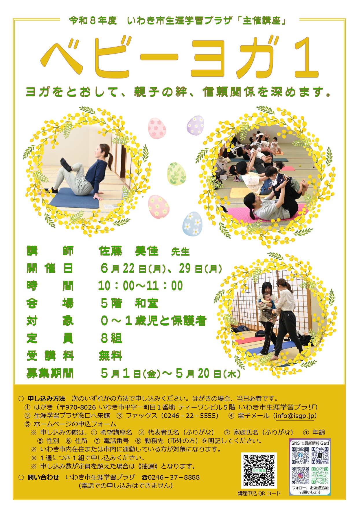 ○6月22日(月) ・6月29日(月) 10:00~11:00 ○会場:5階 和室 ○対象:0~1歳児と保護者 ○定員:8組16名 ○受講料:無料 ○チラシ(PDF) |