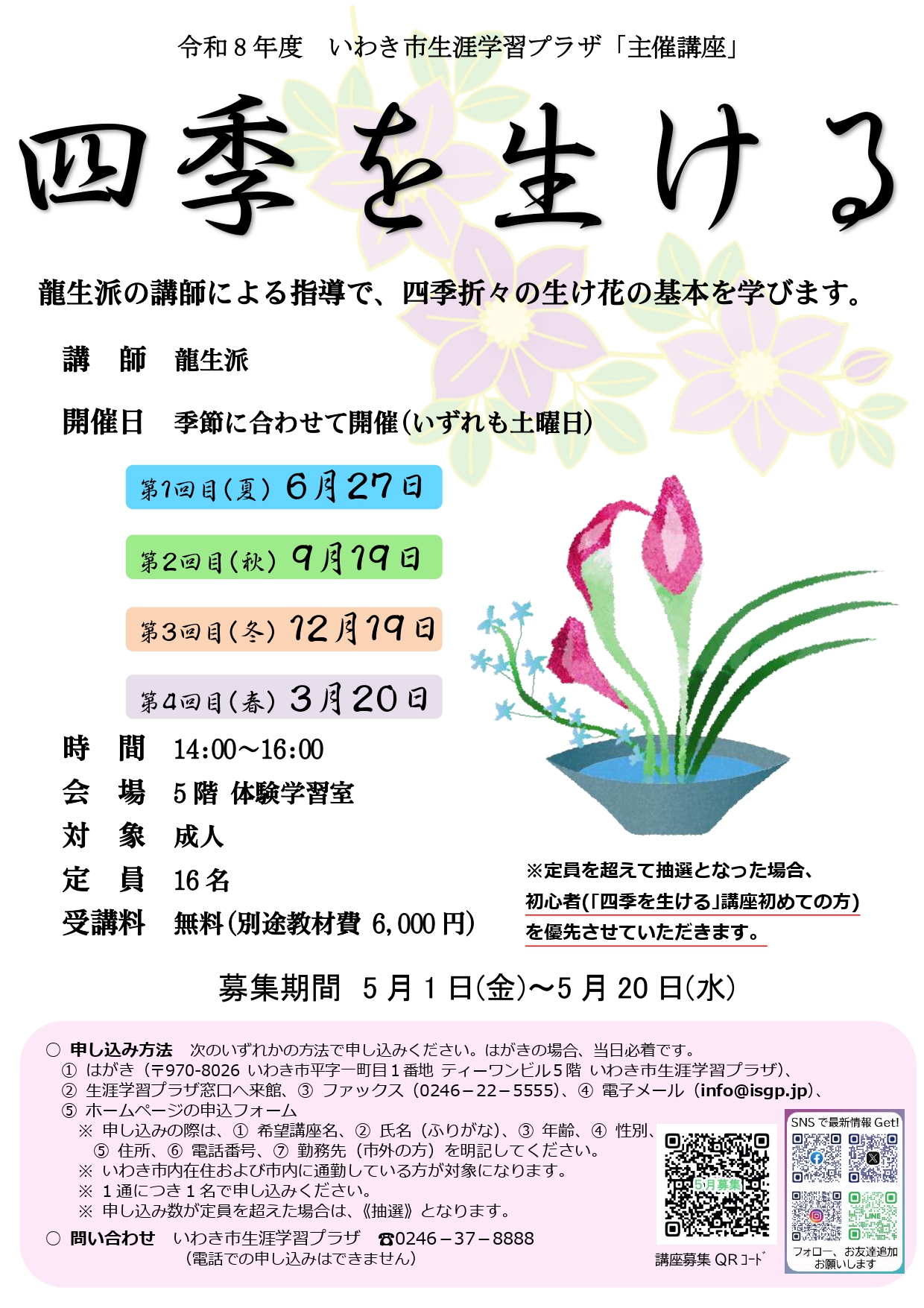 | 龍生派の講師による指導で、四季折々の生け花の基本を学びます。 | |||