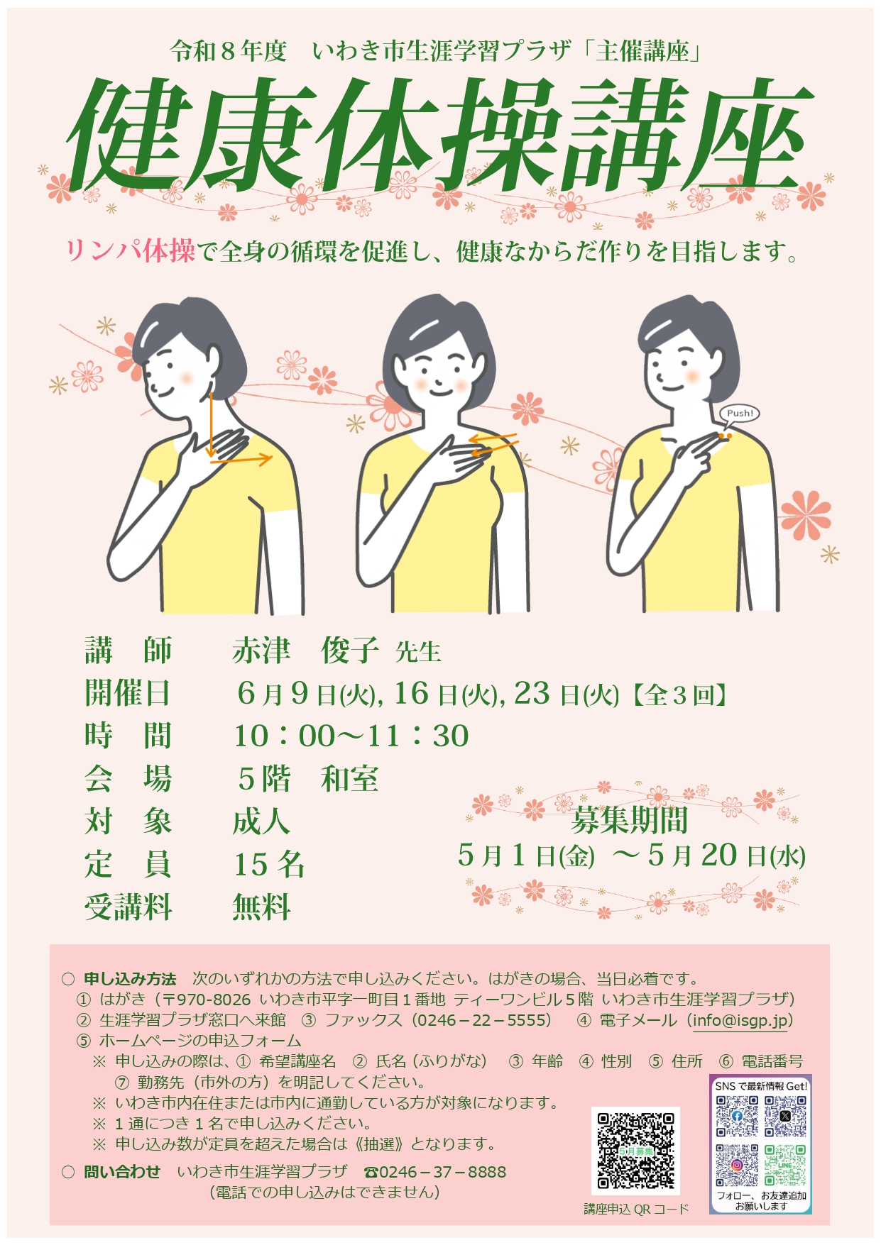 ○6月9日(火) ~6月23日(火)10:00~11:30 ○会場:5階 和室 ○対象:成人 ○定員:15名 ○受講料:無料 ○チラシ(PDF) |