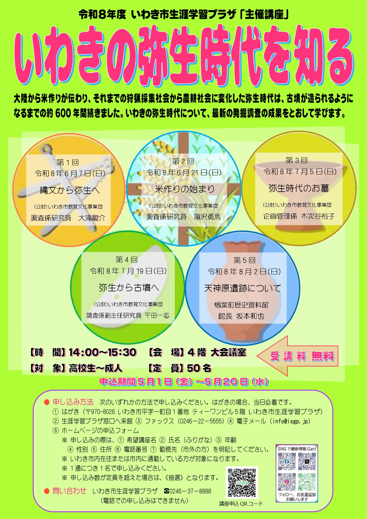 | 編み物経験者向けの講座。日常的に使えるものを作ります。 | いわきの弥生時代について、最新の発掘調査をとおして、学びます。 | ||