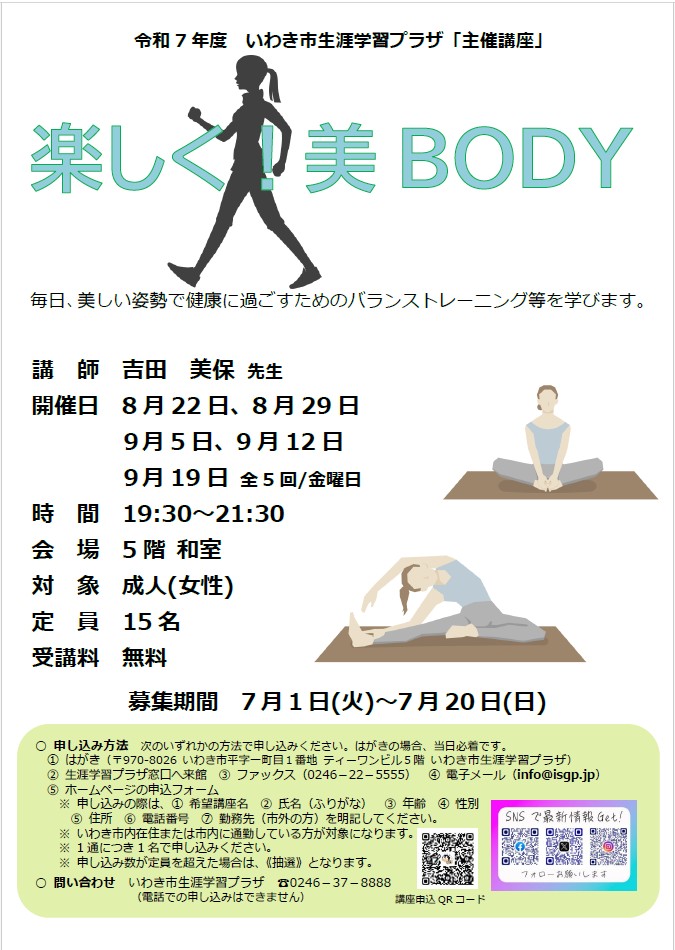 楽しく!美BODY(R7.9.19) 2025.10.122026.04.03 講座の様子 ストレッチやバランストレーニング、リラクゼーション、ウォーキングの方法、骨盤調整、筋トレを実施し、実技を交えた内容で、体を動かしながら正しい姿勢や動きを学ぶことができる講座でした。ストレッチとマッサージは、自宅でのちょっとした時間や就寝前、仕事の合間にも取り入れられるため、今後の運動習慣として継続しやすい運動で、参加者からは、運動強度が低めで安心して受講できた、60代でも無理なくやれた、講師の先生もとても楽しく、また何かの機会に参加したいとの声が寄せられました。 講座概要 開 催 日 令和7年8月22日・29日、9月5日・12日・19日 全て(金) 19:30~21:30 場 所 5階 和室 受講者 延べ46名 受講対象者 成人女性