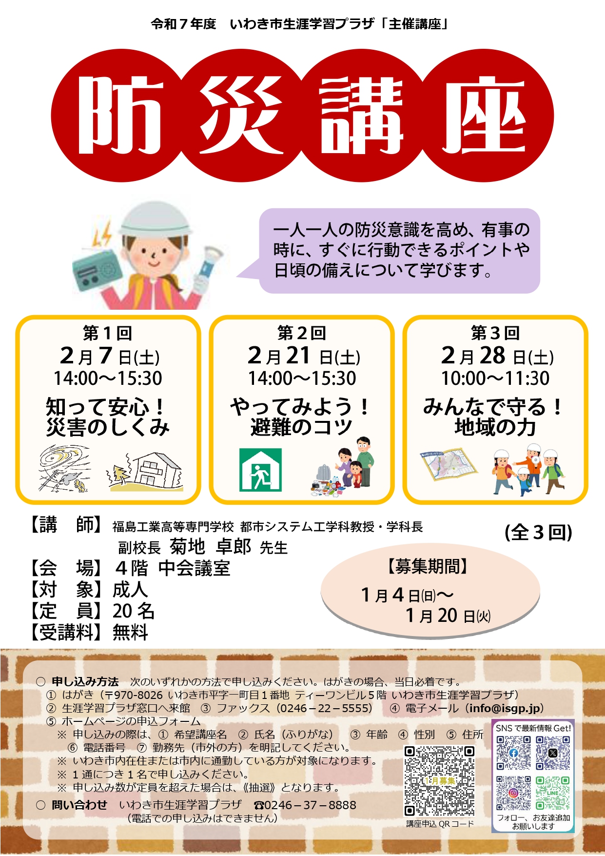 防災講座(R8.2) 2026.03.022026.04.03 講座の様子 いわき市が被災した東日本大震災や令和5年台風18号の状況確認をしたうえで、災害に備える事前準備としての避難のコツやハザードマップの活用方法、日頃の家庭での備蓄物などの説明がありました。さまざまな状況に応じた「備え」がいかに大切か、改めて考えさせられる内容でした。また、視覚資料(スライドや動画)を多用し、初心者でも理解しやすい内容で、参加者からは、防災についての理解が深まった、毎回帰宅後家族に学んだことをフィードバックして共有している、との声が寄せられました。 講座概要 開催日 令和8年2月7日・21日・28日 土曜日14:00~15:30 ※28日は10:00~11:30 場 所 4階 中会議室 受講者 延べ28名 受講対象者 成人