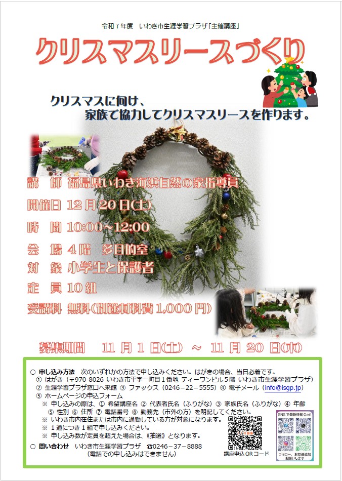 クリスマスリースづくり(R7.12) 2026.01.082026.04.03 講座の様子 天然のツルを丸く曲げて束の輪を作り、ツルの隙間にモミの葉を差し込んで、その上から木の実やクリスマスオーナメントをグルーガンで固定し作成しました。クリスマスの雰囲気を感じながら、親子で協力してオリジナルのクリスマスリースづくりを楽しんでいました。参加者からは、講座の内容がとてもよかったとの回答が多く好評だった一方、実施した時期が12月下旬ということもあり、もう少し早い時期に開催すれば、もっと長く楽しめるとの声もありました。 講座概要 開催日 令和7年12月20日 土曜日10:00~12:00 場 所 4階 多目的室 受講者 10組23名 受講対象者 小学生と保護者